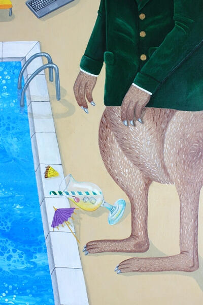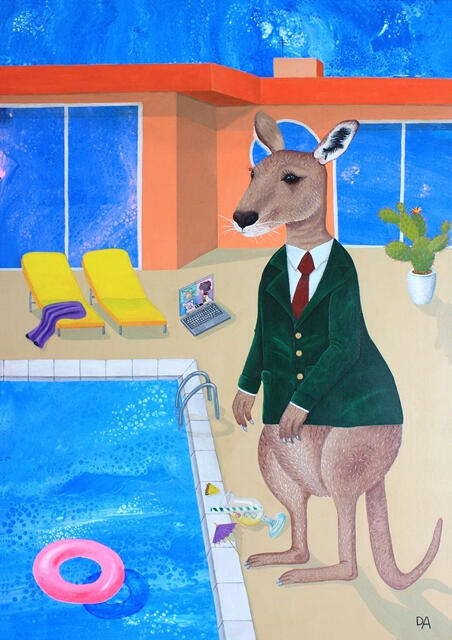 Und doch bleibt etwas angespannt.Das Känguru steht am Pool, an einer scheinbar perfekten Kulisse zum Loslassen. Und trotzdem wirkt sein Blick fast gläsern, als wäre es innerlich nicht ganz da. Als würde etwas es festhalten.Es könnte in den Pool springen. Es will vielleicht sogar. Aber es tut es nicht.Im Hintergrund der offene Laptop mit einem noch laufenden Geschäfts-Call. Der Laptop ist wie ein unsichtbares Band, eine Erinnerung an Verantwortung, Verpflichtung, Kontrolle. Selbst im Paradies bleibt ein Teil von ihm im „Business-Modus“ hängen.Diese Szene beschreibt für mich die Ambivalenz des Archetypen des Führers, des Herrschers.Seine Sonnenseite bringt starke Persönlichkeiten hervor, die führen, leiten, erschaffen und bereichern. Sie sorgen für Struktur und Klarheit für alle und sind unabdingbar für unsere Gesellschaft.Im Job, aber genauso im Privaten, wenn wir Verantwortung übernehmen, die Urlaubsgruppe organisieren oder Entscheidungen treffen, damit etwas funktioniert.Doch die Schattenseite ist der Preis dafür: nicht abschalten können. Nicht loslassen. Nicht einfach nur sein.Und die Angst, dass alles entgleist, sobald man die Kontrolle aus der Hand gibt.Genau zwischen diesen Polen steht dieses Känguru: